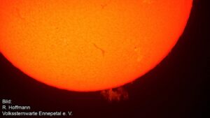 Sonntag, 26.04.2026, ab 14:00Uhr Durch einen speziellen Filter (Ha) vor unserem Teleskop können Sie gefahrlos Details der Sonne betrachten. Protuberanzen, gewaltige Fontänen heißen Gases, schießen vom Rand der Sonne aus Tausende von Kilometern ins Weltall und Magnetstürme der Sonnenflecken zeichnen